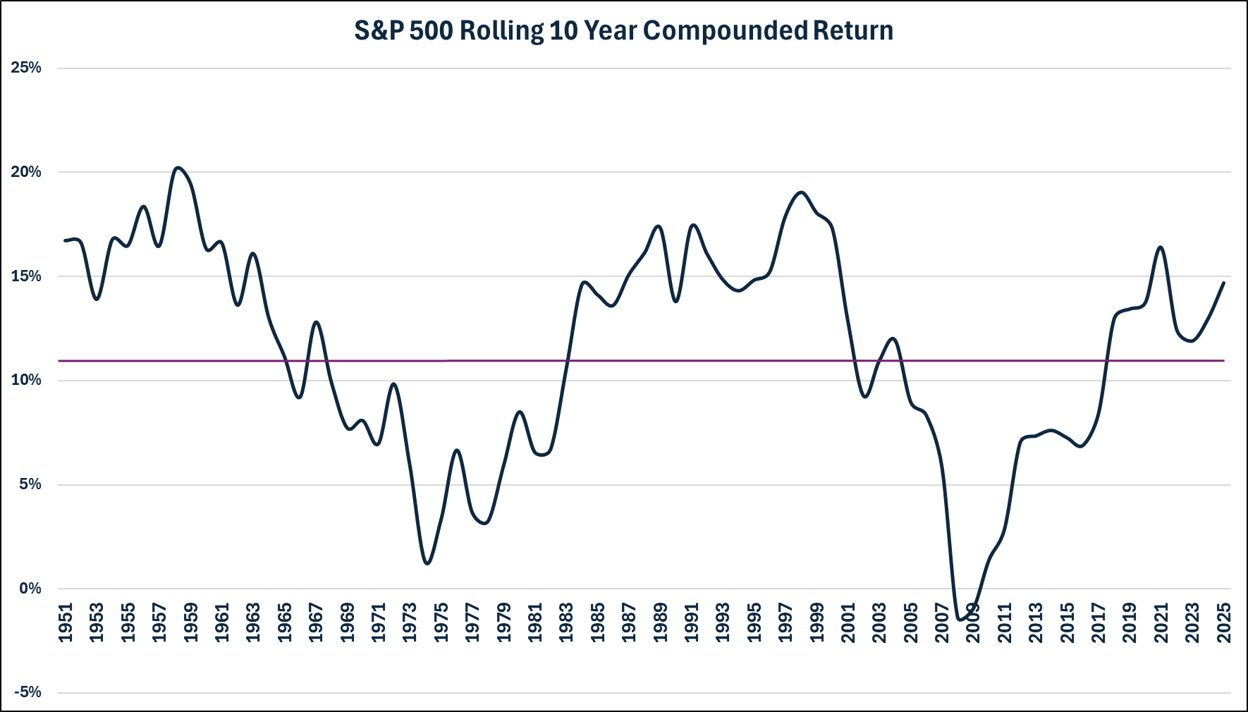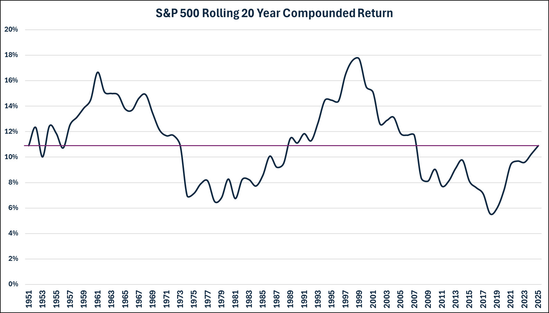 For 20 year rolling returns, NEVER has a 20 year return period been negative, and only three instances less than 5%.