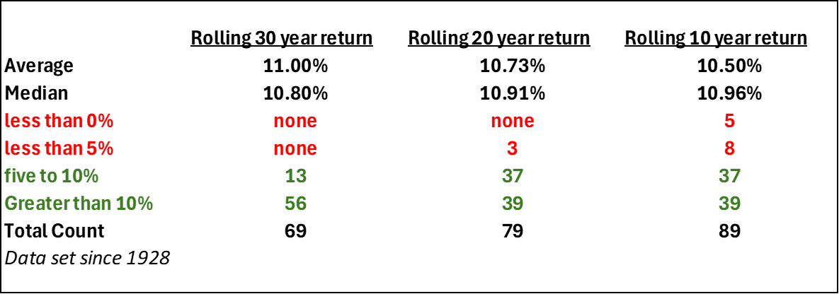 For 10 year rolling returns, the average return since 1928 is 10.50%. Only 5 instances where your 10 year return was less than zero.