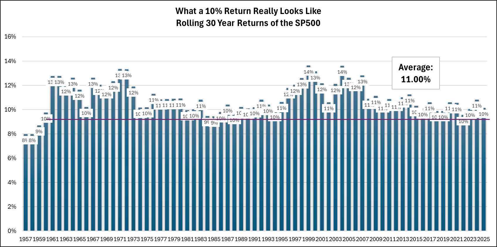 For people in their 20s, 30s, and early 40s, below is what owning stocks for 30 years looks like. Over 69 years of rolling 30 year returns:
