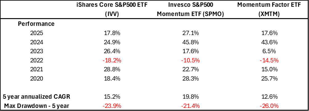 Invesco S&P500 Momentum ETF (Ticker SPMO) has done better than the basic iShares Core S&P500 ETF (Ticker IVV) for 10 years annualized, with a lower maximum drawdown. So too has it outperformed iShares Momentum Factor ETF (Ticker XMTM) which has underperfomed both. Reminder, past performance isn’t a guarantee for future results.